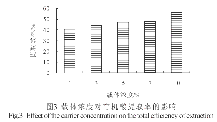 1.2.3载体体积浓度对有机酸提取率的影响有机酸浓度为20g/L,温度为室温,提取时间为360min,载体体积浓度分别为1%、3%、5%、7%和10%的条件下,研究载体体积浓度对有机酸提取率的影响。