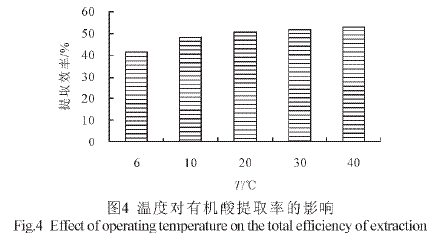 在有机酸浓度为20g/L,载体体积浓度为5%,提取时间为360min,温度分别为6.0℃、10.0℃、20.0℃、30.0℃和40.0℃的条件下,研究提取温度对有机酸提取率的影响。