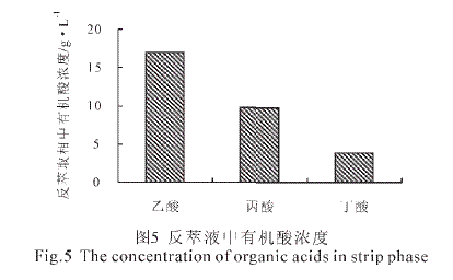 在给液相总有机酸浓度为22.5g/L,给液体积为2L,反萃液体积为1L,载体体积浓度为10%和温度为30℃的条件下,进行了支撑液膜法提取混合液中有机酸的研究,提取360min时反萃取相中的有机酸浓度如图5所示。