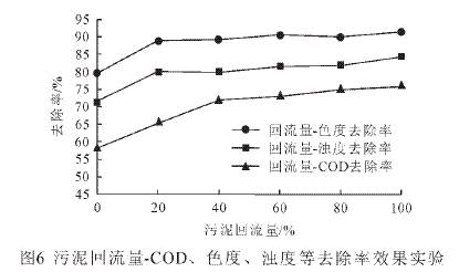 不调废水的pH值,将PAC的投加量控制在3mL/L,进行污泥回流量对COD去除效果的实验,其结果见图6。