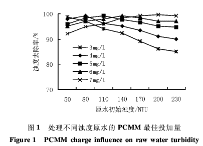 由图1可知,随原水浊度增大,须相应增加PCMM的投加量,才能达到降低原水浊度的目的。原水浊度较小时,对不同浊度原水,PCMM都有相应的最佳投加量,PCMM投加量过低或者过高,都会导致浊度去除率的降低。因为过量PCMM会对出水的透明度造成负面影响,增加出水中悬浮物的浓度。
