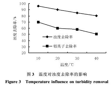 从图3可知,原水温度在10~40℃之间变化时,随温度升高,浊度去除率降低,但都不低于80%;铝离子去除率也降低,但也都不低于50%。