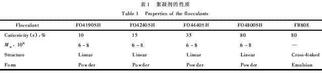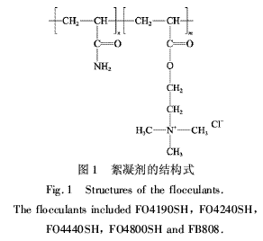 絮凝剂FO4190SH,FO4240SH,FO4440SH,FO4800SH,FB808为丙烯酰胺和丙烯酰氧乙基三甲基氯化铵的阳离子聚合物,分子结构见图1。其中,絮凝剂FB808为交联结构。絮凝剂的性质见表1。