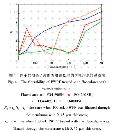 从图4还可知,对于阳离子度较大的絮凝剂FO4240SH,FO4440SH,FO4800SH,随絮凝剂含量的增加,含聚污水的过滤性呈下降-提高-下降的趋势。随絮凝剂含量的增加,Rf先增大至极大值,这是因为絮凝剂未完全参与絮凝过程,而以絮渣的形式从水中析出,残留于污水中,过滤时絮凝剂会和较高含量的油滴混合粘附在滤膜表面,导致含聚污水的过滤性下降;随絮凝剂含量的继续增加,Rf下降,这表明更多的絮凝剂参与了絮凝过程,使含聚污水中的含油量和絮凝剂的含量均开始下降,含聚污水的过滤性也相应地提高;当絮凝剂含量继续增加时,Rf反而又逐渐增大,这是因为虽含聚污水中的含油量减少,但残留的絮凝剂含量增加,导致含聚污水的过滤性下降。当FO4240SH,FO4440SH,FO4800SH的质量浓度分别为300,300,200mg/L时,含聚污水的Rf分别达到最小值(分别为1.52,1.53,1.19),此时含聚污水的过滤性最好。