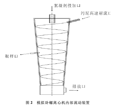 通过控制搅拌速度来模拟高剪切力的环境,搅拌速度会影响絮凝效果,速度过快,会将大胶体或絮体搅碎,同时高分子絮凝剂在高剪切作用下极易断链,造成降解失效。一般搅拌速度以40~80r/min为宜,不要超过100r/min。由于各种文献资料表述的最大搅拌速度不尽相同,搅拌直径也未说明,故以线速度表示,采用两种实验方法,将污泥高速搅拌,再投加絮凝剂,通过对絮凝体沉降效果的考察,判断絮凝剂耐受高剪切力的程度;小试模拟后,进行中试模拟,采用上海市离心机械研究所有限公司研发的专利装置模拟卧螺离心机内部流动状态。