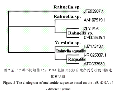 通过对ZLYJY-5进行16SrDNA序列测定,根据ZLYJY-5菌株的16SrDNA序列测定结果,比对不同菌株16SrDNA基因片段核苷酸序列分析,鉴定该菌株为:Rahnellaquatica。根据ZLYJY-516SrDNA序列测定结果,基于7种不同细菌16SrDNA基因片段核苷酸序列分析的同源进化树状图见图2。
