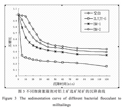 根据不同细菌絮凝剂对铝土矿选矿尾矿的沉降曲线可以看出,ZLYJY-5菌株发酵液作为絮凝剂与其他菌株絮凝剂相比,尾矿的沉降速度最快,沉降压缩比最小。