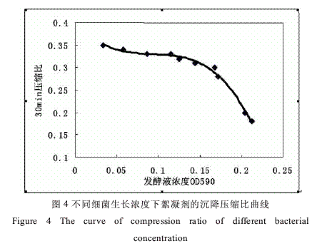 从试验结果可以看出ZLYJY-5菌株的絮凝效果决定于微生物在代谢过程中分泌物的多少,随着细菌发酵时间的延长,细菌生物量增高,代谢产物增多,絮凝效果越好,发酵液浓度和絮凝效果呈同步变化关系,细菌在最佳条件下发酵3天,微生物絮凝剂具有较好的絮凝效果。