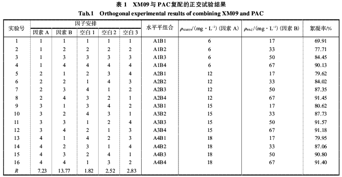根据试验所得XM09和PAC各自的最佳添加量,进行正交试验,以确定最佳的复配比例,并获得最优的絮凝效果.