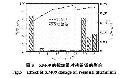 为了验证上面所得的推论(XM09具有去除水中残留铝的作用),进一步探讨了在固定PAC的量为50,mg/L的条件下,投加不同量的XM09对上清液中残留铝的影响,结果见图5.从图5中可以看出,单独使用PAC的水样中残留铝含量最高,而投加了XM09后,产生了2种现象.当XM09的投加量在6~23,mg/L范围内时,絮凝率有小幅度的提升,残留铝却是大幅度的降低,铝浓度由单独投加PAC时的0.184,5,mg/L降低至0.000,8,mg/L;但当XM09的投加量超过30,mg/L时,虽然絮凝率的变化不大,铝浓度却有很大程度的回升,特别是投加量为30,mg/L时,其残留铝浓度竟高达0.172,8,mg/L.这个现象说明,当加入XM09少量时,可能在絮凝作用下,上清液中的铝随水中颗粒物的絮凝沉降而得到去除.而XM09加入过量时,XM09的大量存在可能会影响絮凝剂与生活污水中铝离子或颗粒物的结合方式,同时也会影响PAC在水中的存在形式,从而使得水中的铝浓度也发生了变化.至于在絮凝剂处理生活污水中是否存在一些复杂的作用机理,还需进一步深入探讨.