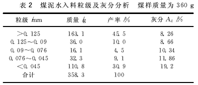 煤泥主要由粗粒和细粒组成,入料煤泥粒级及灰分分析见表2。