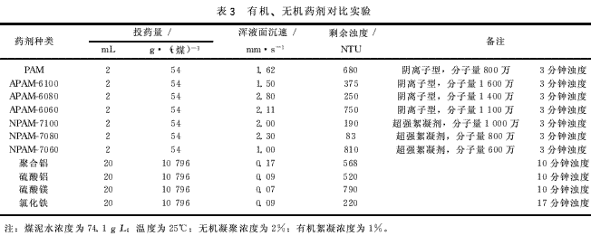 针对司马矿选煤厂煤泥水的特性选择出一种经济、高效、沉速快、出水浊度低的絮凝剂。采用多种无机、有机药剂对比实验,实验结果见表3。