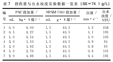 有机絮凝剂投加量为27.0g/t煤,沉速小、浊度高,说明加药量偏小,继续加大投药量实验结果见表7及如图2所示。
