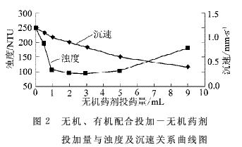 从图1可以看出,当有机絮凝剂投药量为27.0g/t煤,随着无机凝聚剂的增多,浑液面沉速随之下降,浊度下降到一定程度后基本不变,继续增加投药量意义不大。