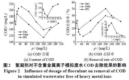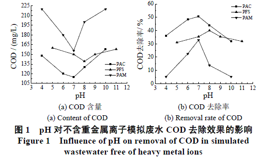 本阶段采用不含重金属的模拟废水为对象,以COD去除效果为指标,得到最佳pH和不同絮凝剂的加药量。具体为:取100mL不含重金属的模拟废水于烧杯中,用硫酸和氢氧化钠溶液调节pH至一定值,分别加入一定量的PAM、PAC或PFS,电磁力搅拌反应20min,静置1.5h,取上清液测COD。絮凝剂加入初期应快速搅拌,使絮凝剂快速分散,且与溶液混合均匀,之后应中速搅拌,避免切断分子链,再慢速搅拌(或静置)使废水絮凝沉淀完全。