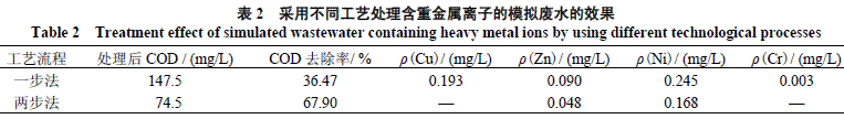 两步法处理工艺的第一步旨在去除COD,第二步旨在去除重金属。表2为采用2种流程处理含重金属模拟废水的结果。从表2可知,该工艺能有效去除废水中的COD和重金属,实现处理后废水的达标排放。