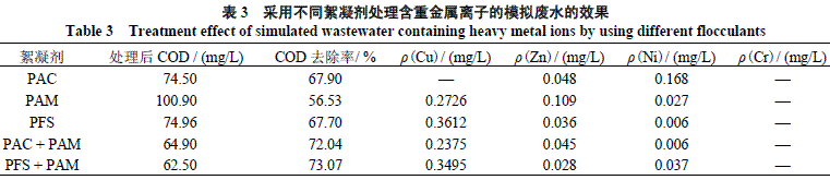 在上述实验的基础上,对比了3种絮凝剂单独和组合使用时对含重金属模拟废水的处理效果。有机絮凝剂和无机絮凝剂组合使用时的质量比为(1∶5)~(1∶10),结果见表3。表3数据显示,虽然采用PAC+PAM处理废水时,重金属的去除效果与单独采用PAC处理废水时相差不大,但由于少量PAM的存在可加快絮凝过程,使污泥成团较致密、含水率较低,COD的去除效果略有提高。因此,选定PAC+PAM组合处理实际的电镀废水。