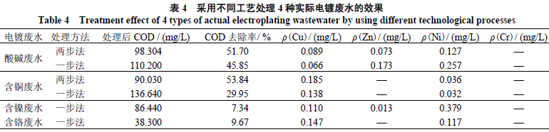 从表4可知,采用不同工艺处理酸碱废水和含铜废水时,两步法能更有效降低废水的COD,实现电镀厂总排水口的达标排放。