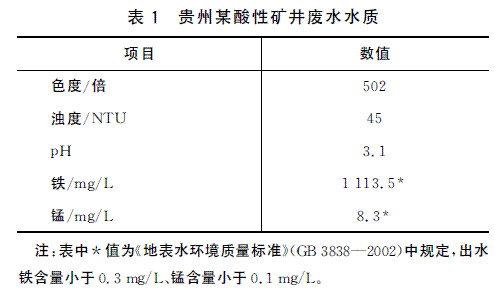 药品:多糖生物絮凝剂,工业用石灰,水样:贵州某酸性矿井废水,水体透明呈淡黄色,长时间暴露空气中后呈红褐色,其水质指标见表1。