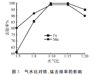 取200mL水样,调节pH为9,分别在气水比分别为1∶5、1∶8、1∶10、1∶15、1∶20条件下曝气10min,加入0.4mL多糖生物絮凝剂,以150r/min的转速搅拌30s,静置沉淀1min后取上清液测定铁、锰含量,相关试验结果见图3。