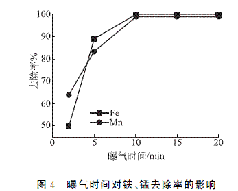 取200mL原水水样,加石灰乳,调节pH至9,气水比为1∶10,分别设曝气时间2min、5min、10min、15min、20min,曝气结束后加入0.4mL微生物絮凝剂,以150r/min的转速搅拌30s,静置沉淀1min后取上清液测定铁、锰含量,计算去除率,相关结果见图4。