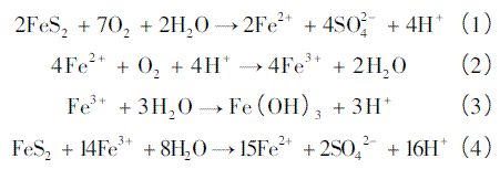 许多学者对黄铁矿的氧化机理都进行了研究,目前普遍认为黄铁矿的氧化过程主要包括以下4个反应[3-4]: