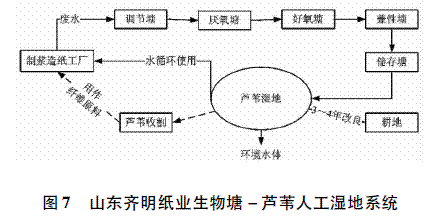 山东省滨州市齐明纸业公司利用滩涂湿地建立了芦苇湿地人工湿地系统,处理造纸污水取得了良好效果。该企业原先是一家以麦草为原料生产瓦楞纸的企业。该企业于2004年使用了由哈尔滨工业大学水污染控制研究中心设计的“曝气沉砂+高效复合厌氧塘+兼氧塘+湿地"的生态塘处理工艺,使兼氧塘出水达到污水排放标准后再用于芦苇湿地恢复,见图7。70%废水经过芦苇湿地处理后又回用于企业生产。该废水处理工程在节约用水的同时,实现了盐碱地的改良。经3~4年改良修复后的盐碱地可开垦种植小麦、玉米等农作物。经过2年的建设和运行,芦苇湿地处理造纸污水取得成功,实现了改良盐碱地和改善生态环境的目的,成为污水资源化利用的范例。