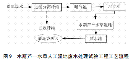 李亚治报道了福建漳州市处理天宝造纸厂再生纤维造纸废水的小型水葫芦-水草人工湿地。在漳州市郊因地制宜用荒废低洼地建造,处理量100m3/d,出水灌溉香蕉园,实现废水零排放。实地基质为红壤和水稻土混合而成,湿地植物为水葫芦和水草。具体工程工艺流程如图9。此系统处理的废水水量为4.2m3/h,CODcr228~511mg/L,BOD5274~589mg/L,SS116~514mg/L,pH7.12~7.49。经过湿地系统处理,CODcr、BOD5、SS的去除率分别为93﹪、98﹪和89﹪,出水达标且可用于灌溉,实现废水资源化。