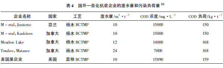 化机浆废水中的污染物质,主要来源于纤维原料中溶出的有机化合物、工艺过程中残余的化学药品和流失的细小纤维。与化学浆中段水和二次纤维造纸废水比较,化机浆用水量少、COD、BOD和SS等污染物浓度高,这是化机浆废水难处理的主要因素之一。表4列出了芬兰、加拿大和美国一些BCTMP化机浆企业的废水量和污染量。同时,化机浆废水污染物的主要成分是木质素降解产物、多糖和有机酸等大分子有机物,其中,木素降解产物占30%~40%,多糖占10%~15%,有机酸占35%~40%,这是化机浆废水难以处理的另一个因素。较大比例的木素降解产物及其他大分子有机物的存在,决定了其废水处理工艺较为复杂,处理系统中设置厌氧单元,与化学浆中段水或二次纤维造纸废水处理工艺存在差异。