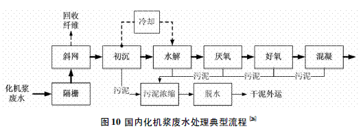 国内数十家化机浆企业普遍采用以厌氧为核心的生物处理技术处理废水,典型的化机浆废水处理流程见图10。化机浆废水温度较高,通常在初沉单元后设置冷却塔,使废水温度从50℃降低至38℃左右。厌氧单元,使用IC(内循环)厌氧塔或EGSB(膨胀颗粒污泥床)厌氧塔的应用越来越普遍,具有处理效率高、占地面积小优势。好氧单元,采用SBR或连续SBR技术,可以克服普通活性污泥法常见的污泥膨胀问题;采用全好氧曝气氧化沟,可抑制传统氧化沟中的硝化和反硝化作用,减少营养盐投加量,提高COD去除率。在“二级生化"之后,增加混凝单元,实际起到了三级处理单元的作用,为出水水质的的达标排放增加了最后一道“保险"作用。