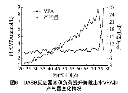 由图5可知,COD容积负荷从2.90kg/(m3.d)提升到21.2kg/(m3.d),随着容积负荷的提升出水COD越来越高。在负荷提升初期,微生物对该种废水适应性良好,出水COD在27~43d均在1200mg/L以下,COD去除率一直保持在85%以上。出水COD在44~77d维持在3900mg/L以下,但COD去除率下降至80%。运行25d时COD去除率突然大幅度下降,这是因为反应器的负荷冲击过大引起反应器运行不稳定。为防止此问题的再发生接下来的运行中通过延长负荷稳定运行时间和降低负荷提升率来控制。由图6知,在反应器运行22~73d时,COD容积负荷从2.90kg/(m3.d)提升到18.5kg/(m3.d),出水pH值维持在7.3~8.2,出水VFA维持在3mmol/L左右,产气量由3.9L/d稳步提升到26.3L/d,反应器运行稳定。当COD容积负荷提升至21.2kg/(m3.d)时,出水pH下降到5.7,出水VFA急剧上升8.9mmol/L,产气量剧烈下降至9.4L/d,反应器开始酸化。