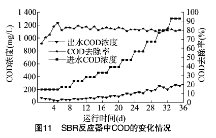 由图9可知,当进水COD浓度为1120mL/L时,出水COD为874mg/L,且有持续上升趋势,COD的去除率只有22%。经分析,由于进水中难降解的有机物加重了SBR反应器的负担,使好氧除污效果下降,出水不达标。