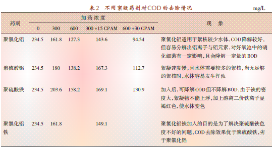 从小试数据看出,相同浓度下,聚氯化铝对COD的去除率大,两种药剂对后期生化影响因为无相关数据,故不能有效地看出,由于用聚硫酸铁类药剂絮凝时,外排水的色度为红色,不符合外排水要求,故仅用聚氯化铝进行中试扩试验。
