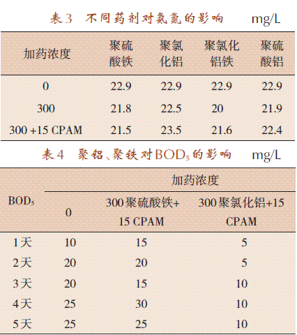 试验对无机高分子絮凝剂中聚氯化铝、聚硫酸铝、聚硫酸铁及聚氯化铝铁几种絮凝剂及组合配方进行筛选,对氨氮、BOD5的影响进行测试,并评价絮凝剂配方经济性。室内试验评价结果如表2~表4(CPAM即阳离子聚丙烯酰胺)。