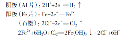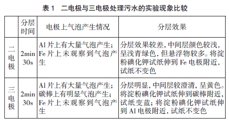 在相同实验条件下,分别采用由纸板固定的二电极(平行放置Fe片和Al片,距离约4cm)和三电极(在距离4cm的Fe片和Al片中间平行放置由5根碳棒捆绑而成的石墨电极),进行实验,结果显示(见表1):阳极石墨的引入增加了氯气的生成量,提高了Fe2+转化为Fe3+的效率,三电极处理污水效果明显优于二电极。