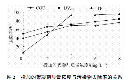 污水的浑浊度和有机物浓度等过高,容易增加超滤膜负荷,影响出水水质。混凝作用通过压缩微颗粒表面双电层、电中和及架桥、网捕、吸附等化学物理过程,可将水中的悬浮物、胶体和可絮凝的其他物质聚成絮团,从而将污染物除去。试验在超滤前投加絮凝剂硫酸铝,为了能得到较好的污染物去除效果和较轻的膜污染,试验需讨论投加的最佳絮凝剂质量浓度。试验投加的絮凝剂硫酸铝质量浓度分别为0,2,4,6,8mg/L。由于超滤工艺对浑浊度、SS、粪大肠菌群的去除起保障作用的,是超滤膜的筛分作用,而不是絮凝剂的絮凝效果,因此,投加的絮凝剂最佳质量浓度主要通过有机物和TP的去除率以及膜污染情况来确定。其中有机物的去除率通过COD和UV254的去除率表征,膜污染情况通过跨膜压差的变化表征。
