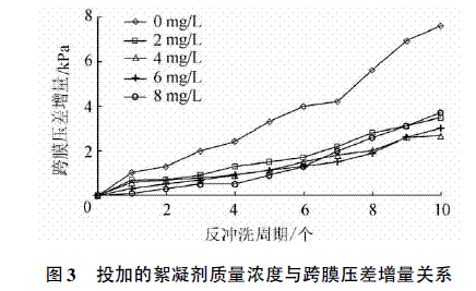 投加的絮凝剂质量浓度对跨膜压差增量的影响见图3。在10个反冲洗周期结束后,未投加絮凝剂的跨膜压差增量达到7.6kPa,而投加絮凝剂的跨膜压差增量低于4.0kPa。与未投加絮凝剂时相比,跨膜压差的增量明显降低。由图3可知,跨膜压差增量并未与投加的絮凝剂质量浓度成反比,投加的絮凝剂质量浓度在4~6mg/L时效果最好,达到8mg/L后跨膜压差增量反而增加,其主要原因为:投加较小质量浓度的絮凝剂产生的絮体较少,超滤膜表面形成滤饼层的时间长且滤饼层疏松;投加的絮凝剂质量浓度达到8mg/L后形成的絮体变多,超滤膜表面形成滤饼层更快且密实,更不容易在反冲洗中被冲洗掉。