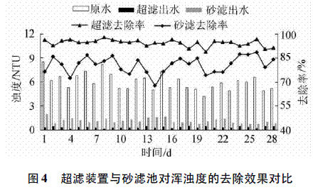 超滤膜孔径小于0.1μm,能有效截留原水中的悬浮固体和胶体颗粒,对浑浊度有明显的去除效果[6-7]。较砂滤工艺,超滤工艺可截留悬浮物质的粒径远小于砂滤工艺。超滤装置出水和砂滤池出水浑浊度的去除效果对比情况见图4。