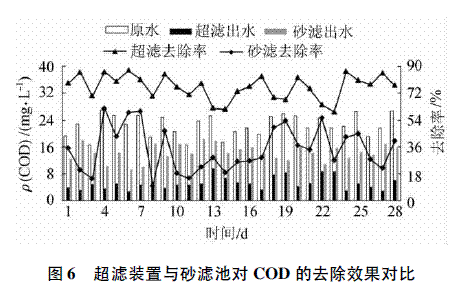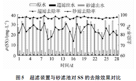 超滤装置对SS的去除主要是依靠物理筛分作用,而砂滤则主要依靠悬浮颗粒与滤料颗粒之间的粘附作用,因此超滤装置对SS的去除能力强于砂滤。超滤装置对SS的去除效果见图5。