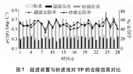 超滤装置对TP的去除效果见图7。从图7可看出,原水中TP的质量浓度为0.55~0.86mg/L,超滤装置出水中TP的质量浓度为0.25~0.36mg/L,平均去除率52%。污水处理厂砂滤池出水中TP的质量浓度为0.27~0.40mg/L,平均去除率49%,与超滤装置去除率差别不大。超滤装置对TP的去除机理主要是铝离子与正磷酸根结合产生不溶于水的盐,从而被超滤膜截留,超滤对溶解态的正磷酸根本身去除作用不大,这也是在处理相同硫酸铝投加量的原水情况下,超滤与砂滤TP去除率接近的原因。