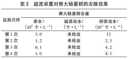 超滤对粪大肠菌群的去处主要依靠其物理筛分作用。超滤装置粪大肠菌群的去除效果见表2。超滤装置对粪大肠菌群的去除率达到100%。超滤膜的孔径小于0.1μm,而大肠杆菌的大小为1~3μm,理论上可完全去除。超滤工艺出水能满足GB/T19923—2005《城市污水再生利用工业用水水质》的标准。与砂滤相比,超滤工艺在对粪大肠菌群的去除效果表现出优越性。