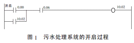 污水处理系统的开启过程如图1所示。常开分别为0000和0006,线圈则为1002,在常开0000的情况下设定了一个自保1002。自保是整个污水处理系统中不可缺少的一部分,如果系统出现毛病,那么就要发挥自保的作用。这段程序的主要作用是开启系统,保证污水处理过程的正常运转。常开为0000,线圈为1002,表示需要工作人员的介入,实行自动或手动的方式进行污水的处理;常开为0006,表示此时整个系统是关闭状态;1002的指示灯处于常亮状态,表示工作仍在进行,1002存在自保能力。