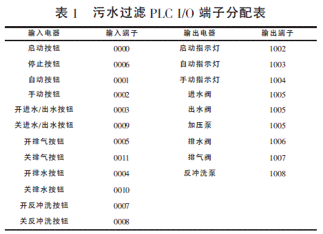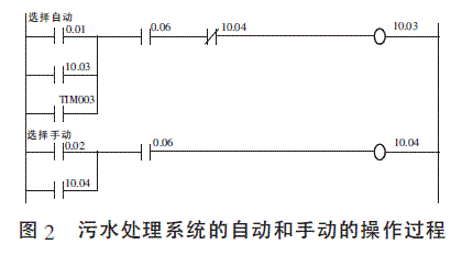 污水处理系统自动和手动的两种操作过程如图2所示。在自动状态下,常开0001,常开0006,常闭1004,线圈1003。在常开的下面还有两种指令:常开1003,此时系统处于能够自保的状态,基于自保作用的重要性,必须保证常开1003的设定状态;在自保常开1003的下面还有一个常开TIM003,作用是保证系统的衔接性,缺少这个指令会影响该设备后的工艺流程。如果在这之后增加一个线圈1003,那么会在很大程度上增强系统的稳定性,并有利于保证过滤效果。这样的设置方式有利于系统自动状态的运行,设置的数据结合整个系统的程序就可以保证系统中记数器和定时器的正常工作。自动状态的设置是常开0002,常开0006,线圈1004,然后在常开0002的下面设定一个常开1004,结合主线上常开0002,保证常开1004的自保能力。手动状态的设置是常开0002,线圈1004,系统的自保能力是一直启动的。自动和手动的工作方式互不干扰,如果是自动状态,那么就完全不需要工作人员操作。