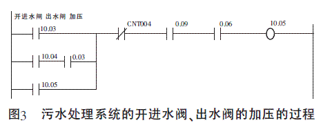 污水处理系统开进水阀、出水阀和加压过程如图3所示。设置数据信息是常开1003,常闭CNT004,常开0009,常开0006,线圈1005,输出是1005有自保。在常开1003的下面还有一个常开1004,常开1004的功能是链接后续工序。而且在常开1003下面设置了常开1005,常开1005和线圈1005结合使用。假如这个位置没有常开点1005,就不能控制开进水阀和出水阀,也不能进行加压的操作。污水的净化过程是发生在储存罐中的,在污水引入储存罐之前要进行程序设置,然后打开阀门引入污水。要处理更多的污水,必须保证水的循环性,必须要加压,将更多污水压到罐中,才能提高污水处理的效率和效果。出/进水阀和加压电机是同时工作、同时停止的。要有一个输出装置保证水的循环。