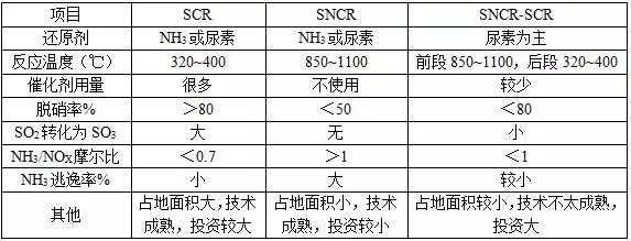 上面分别对SCR、SNCR和SNCR-SCR混合法等三种烟气脱硝技术的原理及特点进行了阐述,下表为三种技术的综合比较: