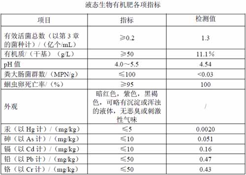 根据广西省测试分析中心出具的验收报告,项目生产的产品品质符合广西鸿生源环保科技有限公司企业标准《液态生物有机肥》(Q/HSYHB11-2009)要求,各项指标如表1所示。