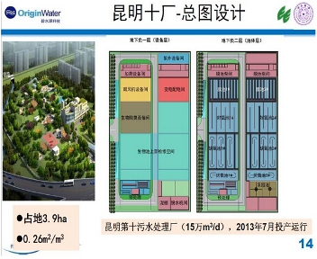 第二个我跟大家汇报一下我们的案例,昆明第十污水处理厂。这是15万吨的,周边有立交桥,地方只有这么大,在这样的情况下,选择了MBR的技术。因为离居民很近,如果在地上建的话,肯定也会遭到很多老百姓反对。