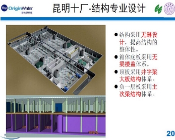 我谈一谈这个厂的结构专业设计,这是施工的情况,基础是筏板基础。我对这个工程的结构了解了很多。整个池子是地下的,无缝的,顶层是景观层。每一个结构设计方式都是不一样的,这是景观层做的实验照片。这是两回路,70%的供电就可以了,地上是100%,都是二级负荷,但是变压器容量达到100%。因为地下污水处理厂对消防和应急照明要求比较高,我们配了500KVA备用发电机组。会有应急照明,在特殊的,特别是消防控制中心,发电机房等场合要做应急照明,要求30分钟连续供电的时间。自控方面要求也是很严的。除臭也是地下式污水处理厂非常重要的一环。
