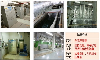 除臭这个环节是被动式的,只要做在地下,必须做好除臭,不做好除臭,这个厂是不能正常运营的,地上污水处理厂没有这个问题,所以除臭是要考虑的,不同的区域,采用不同的除臭的方法。比如说预处理,地上污水处理厂污泥这块不会除臭,地下这块也要除臭,用生物除臭的方法,空间也要做活性炭吸附。除臭换气要求2小时一次,这是除臭的照片。