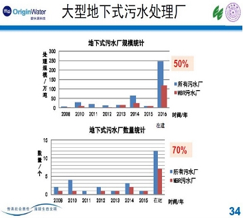 最后我们看一下应用发展,我们做了一个统计,目前我们自己大概十几个在建或者建好的污水处理厂,MBR技术在规模水量上占了一半,数量上占了70%,10个里面有7个是用MBR的。MBR技术在地下还是比较受欢迎的。
